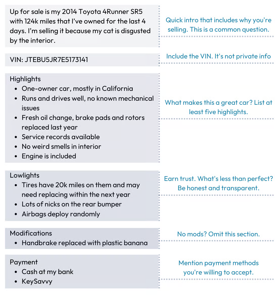 If you still owe money on your car, buyers may hesitate if you don’t explain how the title will be transferred. Be upfront in your listing: