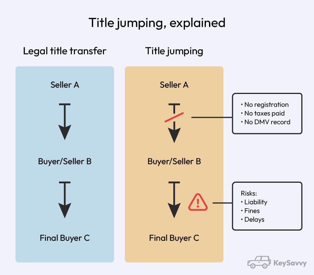 Title jumping is the illegal act of buying a vehicle without properly transferring the title, then selling it to another person. The buyer leaves the title “open” by not signing or registering it in their own name before reselling the vehicle.